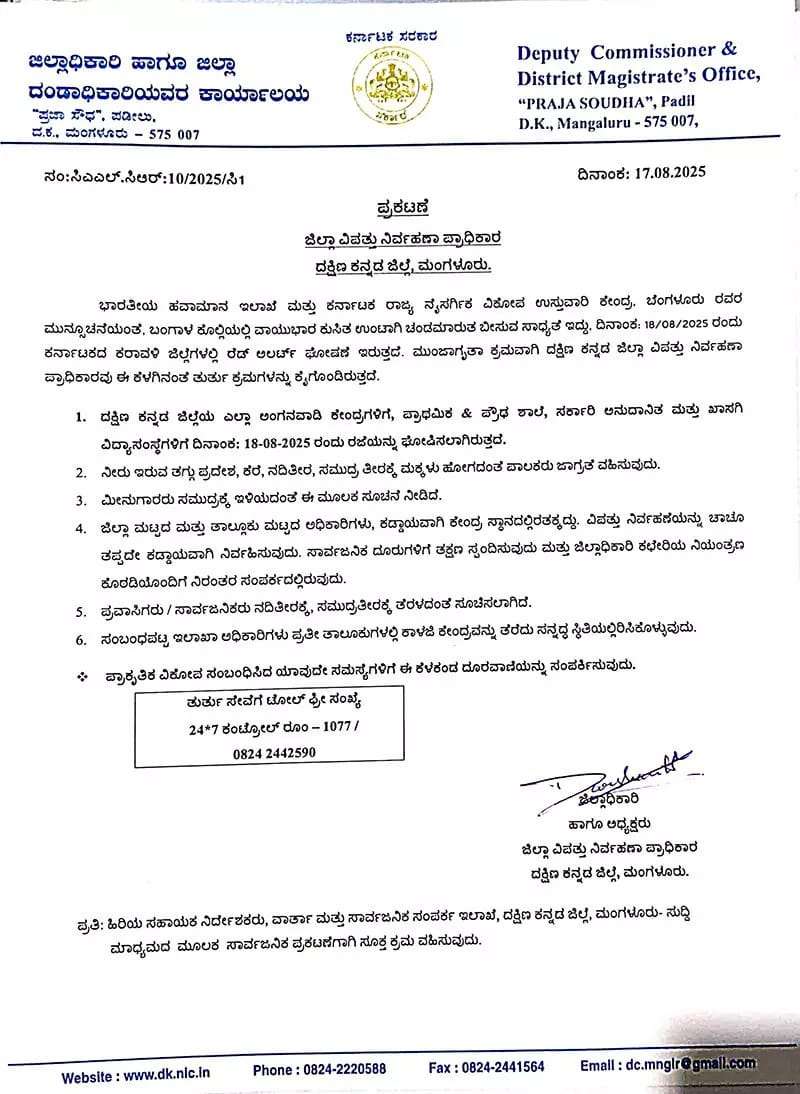 ನಾಳೆ (ಆ.18) ದಕ್ಷಿಣ ಕನ್ನಡ ಜಿಲ್ಲಾದ್ಯಾಂತ ಶಾಲೆಗಳಿಗೆ ರಜೆ