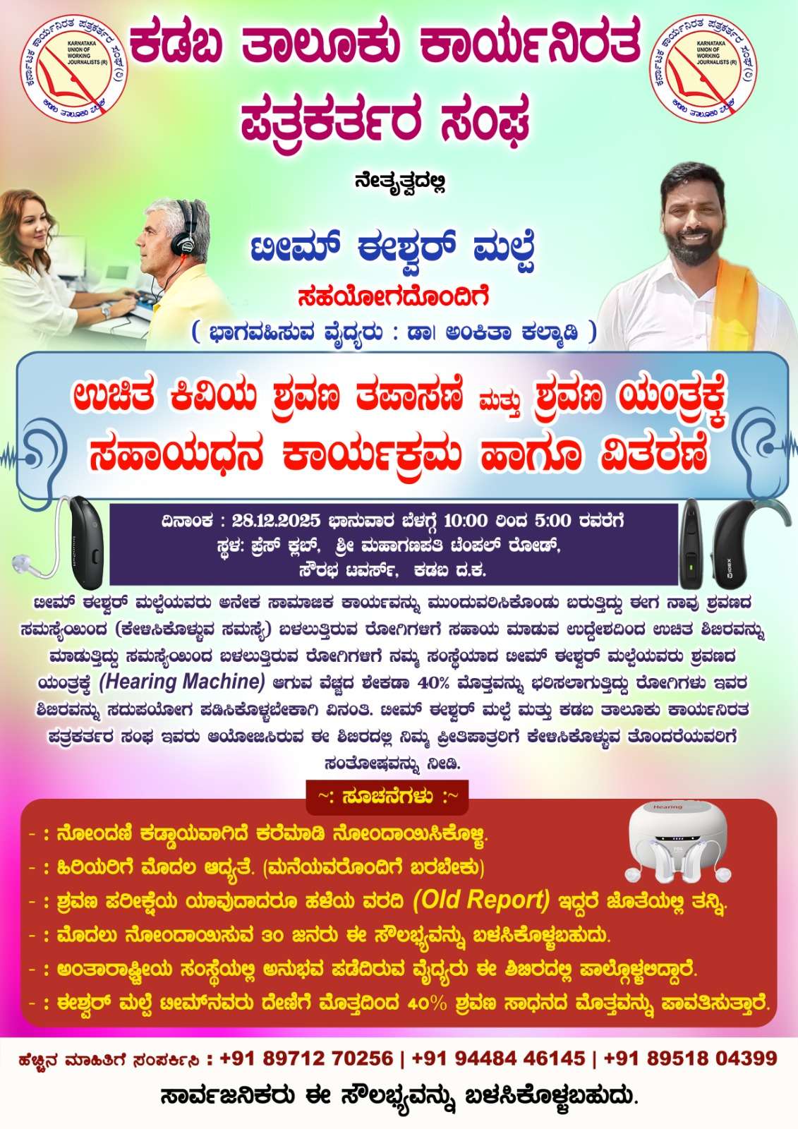 ಶ್ರವಣದ ಸಮಸ್ಯೆಯಿಂದ (ಕೇಳಿಸಿಕೊಳ್ಳುವ ಸಮಸ್ಯೆ) ಬಳಲುತ್ತಿರುವ ರೋಗಿಗಳಿಗೆ ಸಹಾಯ ಮಾಡುವ ಉದ್ದೇಶದಿಂದ ಈ ಉಚಿತ ಶಿಬಿರವನ್ನು ಆಯೋಜಿಸಿದ್ದು ಸಮಸ್ಯೆಯಿಂದ ಬಳಲುತ್ತಿರುವ ರೋಗಿಗಳಿಗೆ ಟೀಮ್ ಈಶ್ವರ್ ಮಲ್ಪೆ ತಂಡ ಶ್ರವಣದ ಯಂತ್ರಕ್ಕೆ (Hearing Machine) ಆಗುವ ವೆಚ್ಚದ ಶೇಕಡಾ 40% ಮೊತ್ತವನ್ನು ಭರಿಸುತ್ತಿದೆ. ಅಂತಾರಾಷ್ಟ್ರೀಯ ಸಂಸ್ಥೆಯಲ್ಲಿ ಅನುಭವ ಪಡೆದಿರುವ ವೈದ್ಯೆ ಡಾ| ಅಂಕಿತಾ ಕಲ್ಯಾಡಿ ಅವರು ಶಿಬಿರದಲ್ಲಿ ಭಾಗವಹಿಸಲಿದ್ದಾರೆ. ಸಾರ್ವಜನಿಕರು ಈ ಶಿಬಿರದ ಪ್ರಯೋಜನ ಪಡೆದುಕೊಳ್ಳುವಂತೆ ಟೀಮ್ ಈಶ್ವರ್ ಮಲ್ಪೆ ಮತ್ತು ಕಡಬ ತಾಲೂಕು ಕಾರ್ಯನಿರತ ಪತ್ರಕರ್ತರ ಸಂಘ ಪ್ರಕಟಣೆಯಲ್ಲಿ ತಿಳಿಸಿದೆ. ಹೆಚ್ಚಿನ ಮಾಹಿತಿಗಾಗಿ 8971270256, 9448446145 ಅಥವಾ 8951804399 ಸಂಖ್ಯೆಯನ್ನು ಸಂಪರ್ಕಿಸಬಹುದಾಗಿದೆ.