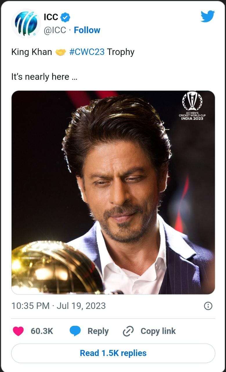 ಈಗಾಗಲೇ ಶಾರುಖ್ ಖಾನ್ ರವರು ಟ್ರೋಫಿಯೊಂದಿಗೆ ಪೋಟೋವೊಂದಕ್ಕೆ ಪೋಸ್ ನೀಡಿದ್ದು, ಅಂತರಾಷ್ಟ್ರೀಯ ಕ್ರಿಕೆಟ್ ಮಂಡಳಿಯ ಅಧಿಕೃತ ಟ್ವಿಟರ್ ಹ್ಯಾಂಡಲ್ ತಾರೆಯ ಚಿತ್ರವನ್ನು ಹಂಚಿಕೊಂಡಿದೆ.