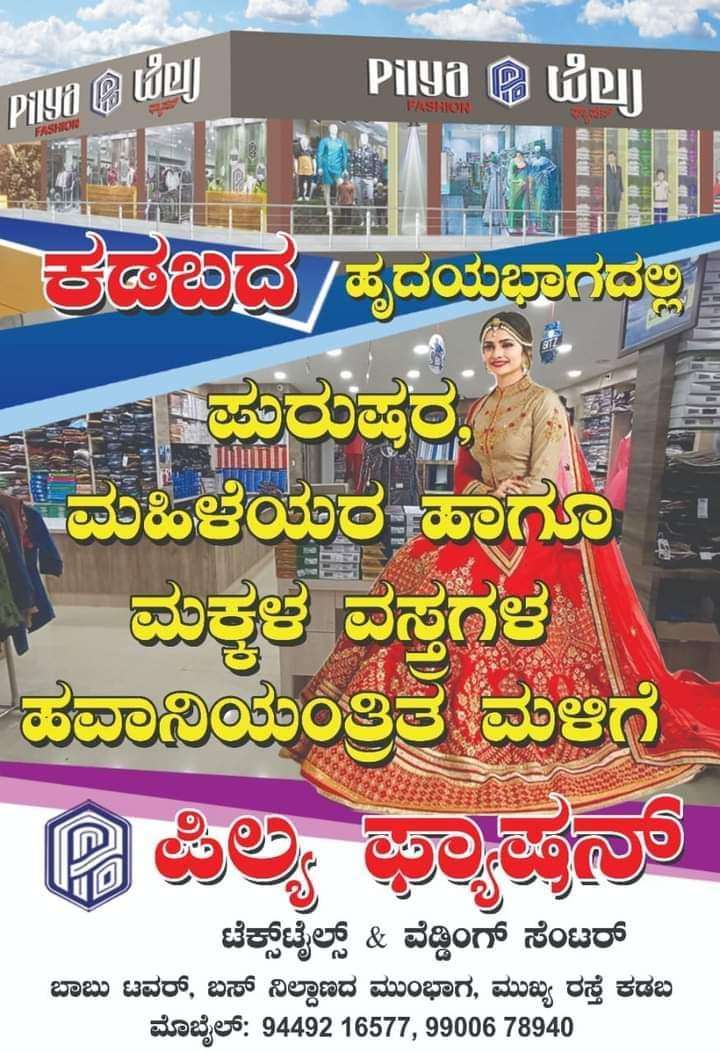 ಕಡಬದ ಪಿಲ್ಯ ಫ್ಯಾಷನ್ ನಲ್ಲಿ ಸೇಲ್ಸ್ ವಿಭಾಗಕ್ಕೆ 4 ಮಹಿಳಾ ಸಿಬ್ಬಂದಿಗಳು ಮತ್ತು ಇಬ್ಬರು ಪುರುಷ ಸಿಬ್ಬಂದಿ ಬೇಕಾಗಿದ್ದಾರೆ. ಟೆಕ್ಸ್ ಟೈಲ್ಸ್ ಕ್ಷೇತ್ರದಲ್ಲಿ ಅಥವಾ ಫ್ಯಾನ್ಸಿಯಲ್ಲಿ ಕನಿಷ್ಠ 6 ತಿಂಗಳು ಅನುಭವವಿರುವ ಸ್ಥಳೀಯರಿಗೆ ಆದ್ಯತೆ ಕಲ್ಪಿಸಲಾಗಿದೆ. ಆಕರ್ಷಕ ವೇತನ ನೀಡಲಾಗುವುದು. ಹೆಚ್ಚಿನ ಮಾಹಿತಿಗಾಗಿ ಪಿಲ್ಯ ಫ್ಯಾಷನ್ ಗೆ ಭೇಟಿ ನೀಡಬಹುದಾಗಿದೆ.