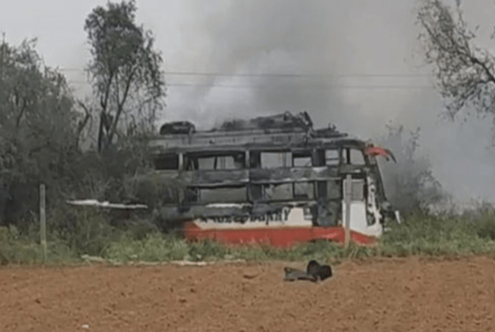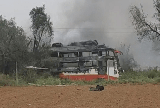 ಹೈಟೆನ್ಷನ್ ವಿದ್ಯುತ್ ತಂತಿಗೆ ತಗುಲಿ ಹೊತ್ತಿಉರಿದ ಬಸ್; ಇಬ್ಬರು ಸಜೀವ ದಹನ, ಹಲವರಿಗೆ ಗಾಯ